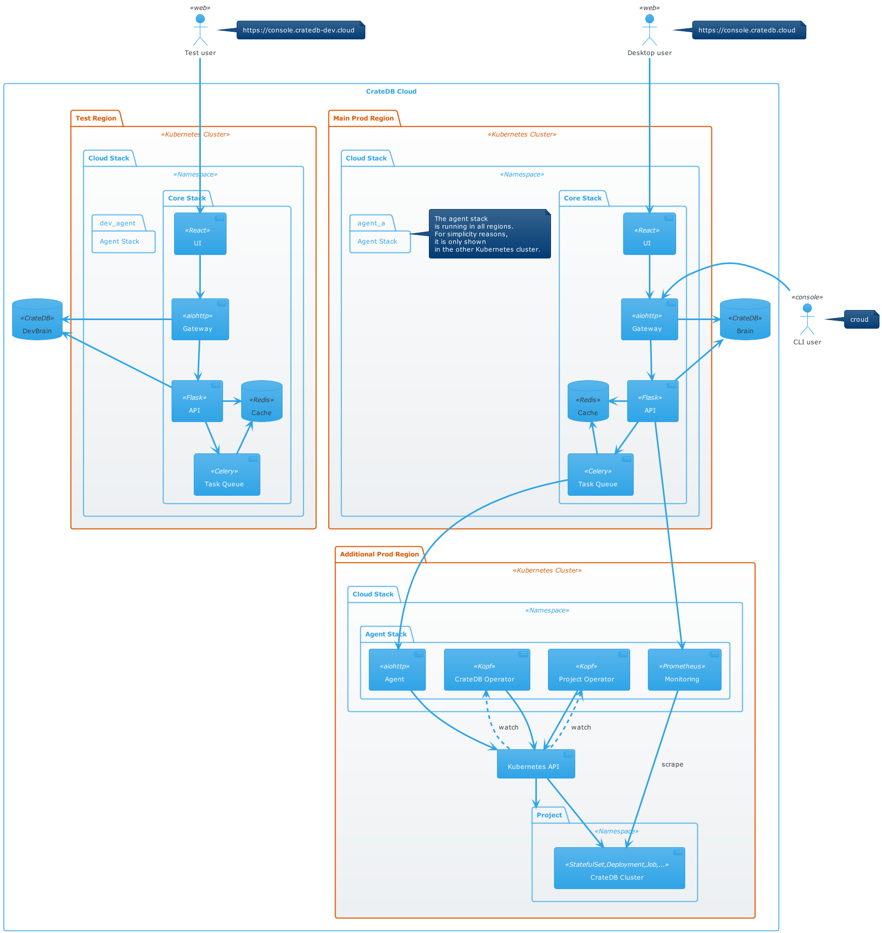 The web user interface of CrateDB Cloud is served from a single domain console.cratedb.cloud. The DNS record of this domain is a collection of CNAME records with a geolocation routing policy. This means that traffic from different parts of the world are statically routed to different regions where the Cloud UI and the Cloud API are served from.